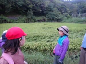 「川の水は増水しているんじゃない?」「川の生き物はみんな流されているんじゃない?」「山は地面がドロドロだろうね」「木の枝や葉っぱがたくさん落ちていると思う!」など予想をもって里山に出てみると、川や山の様子・景色がいつもと少し違いました。田んぼをみると倒れているイネの部分が巨人の足跡のようです。「UFOの仕業?」「動物?」「風で倒れたんじゃない?」「倒れたイネはもう食べられないのかな」色々疑問が出てきます。