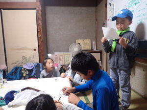 台風から5日ほど経っていたので「増水はしていないね」「水は思ったよりきれい」などの発見もありました。こどもたちは台風のあとのいつもと違う里山の景色や様子を見て、少しわくわくしているようにも見えました。振り返りでは発見した出来事に対して新たな予想や意見が飛び交っていました。