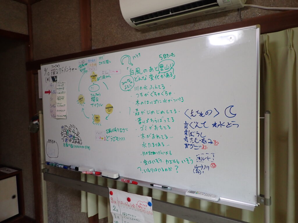 さて9月の最初、台風でadventureの活動が中止になってしまいました。その次の週、「台風の後の里山はどうなっているのだろう?」というハテナにみんなで色々予想を出し山に確かめに行きました。