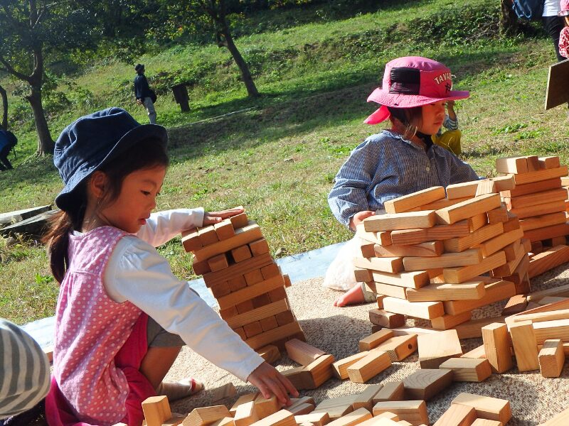 落ち葉プール、木のブランコ、ハンモック、ティピ、木片積木